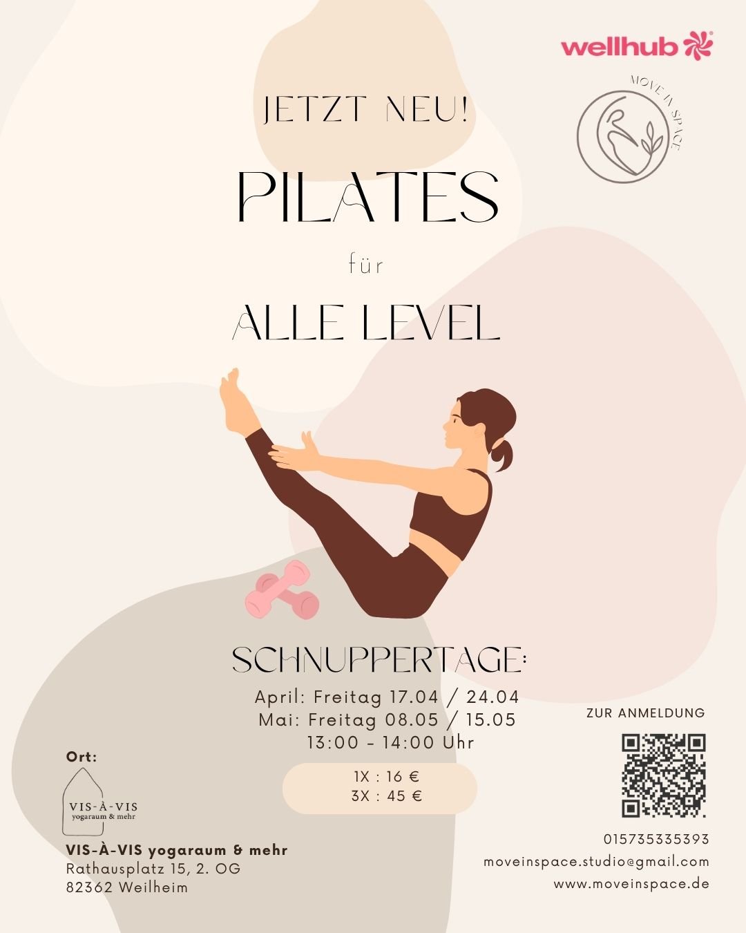 Egal ob Anfänger oder Fortgeschrittene – in dieser Pilates-Stunde bist du genau richtig. Dich erwartet ein ganzheitliches Training, das Kraft, Beweglichkeit und Körperbewusstsein vereint. Mit fließenden Übungen stärken wir gezielt die Tiefenmuskulatur, verbessern deine Haltung und bringen Körper und Geist in Einklang.